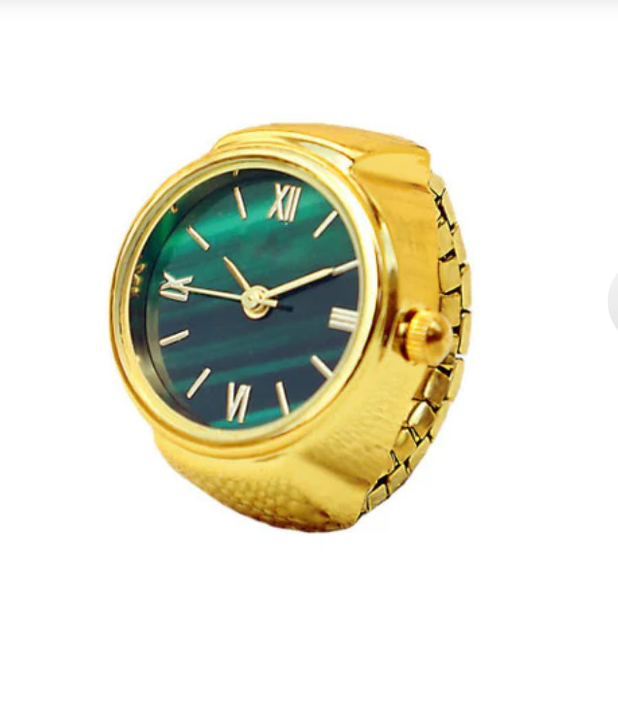 Une bague dorée au cadran vert émeraude profond, à la fois précieuse et audacieuse. Elle donne l’heure avec élégance et beaucoup de style.